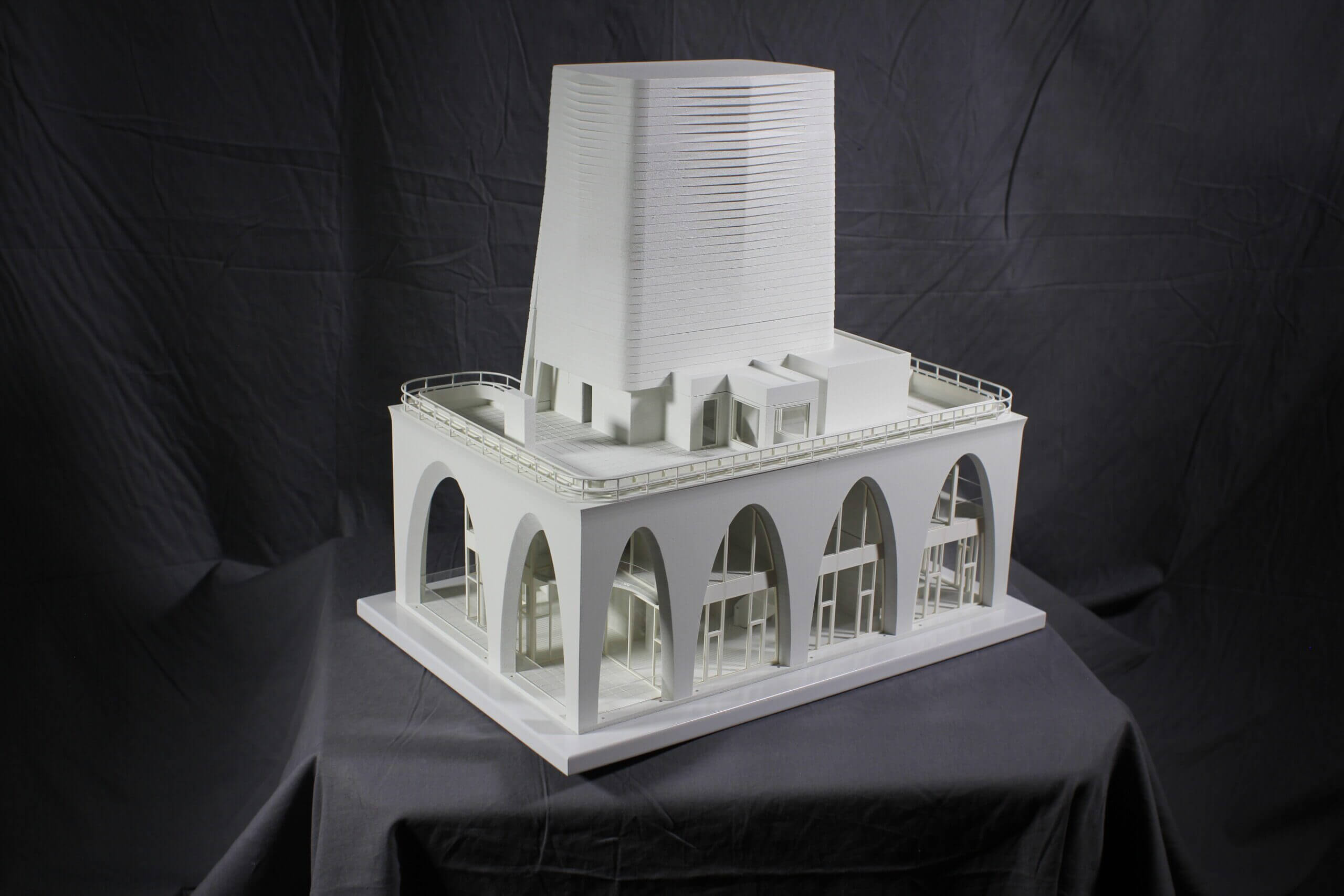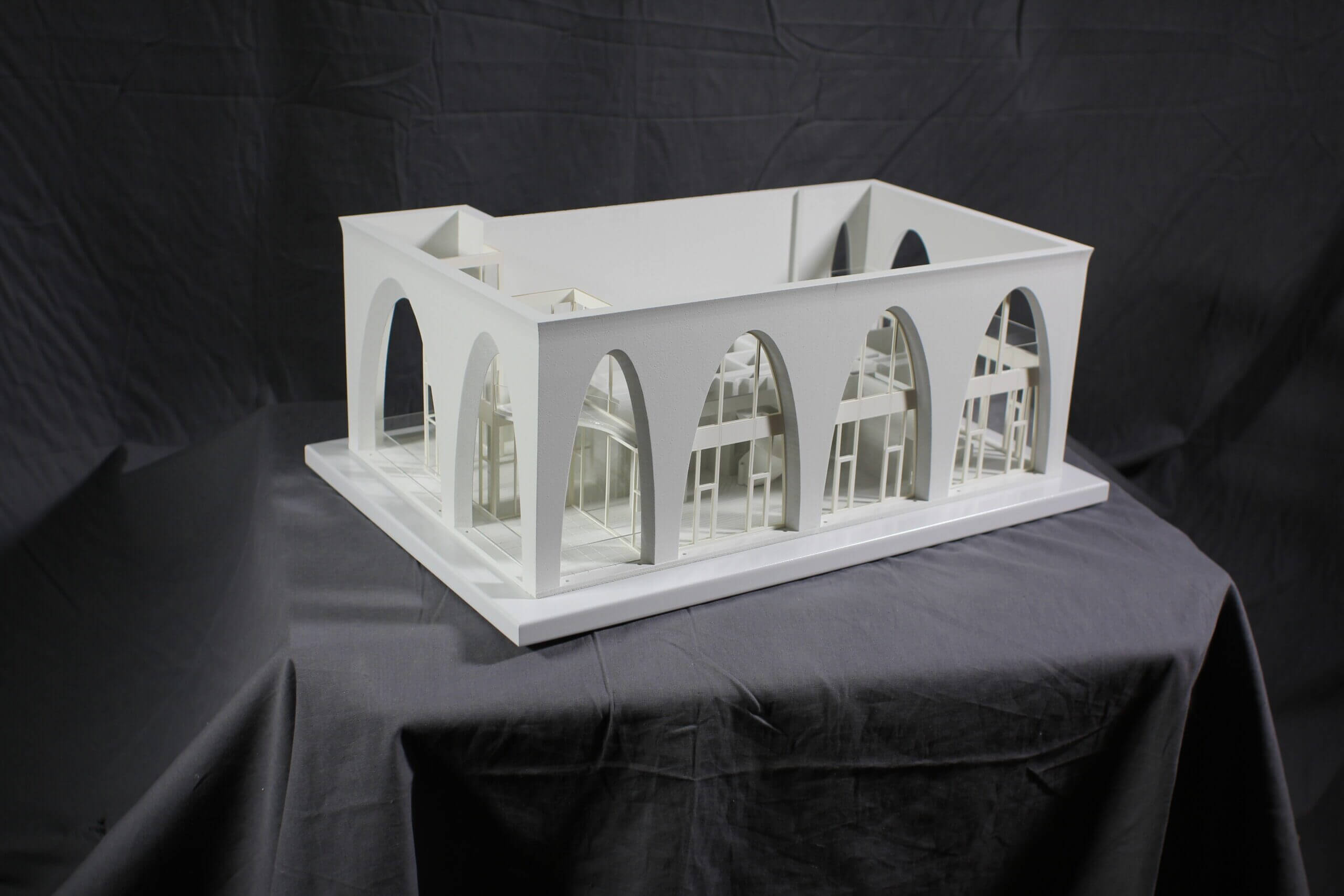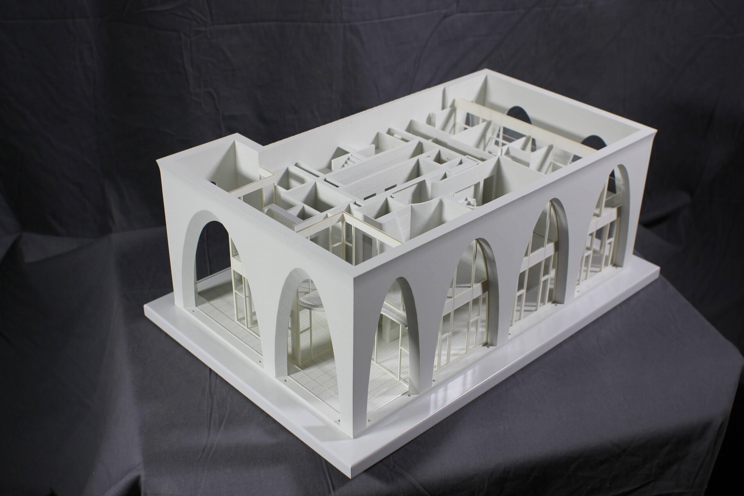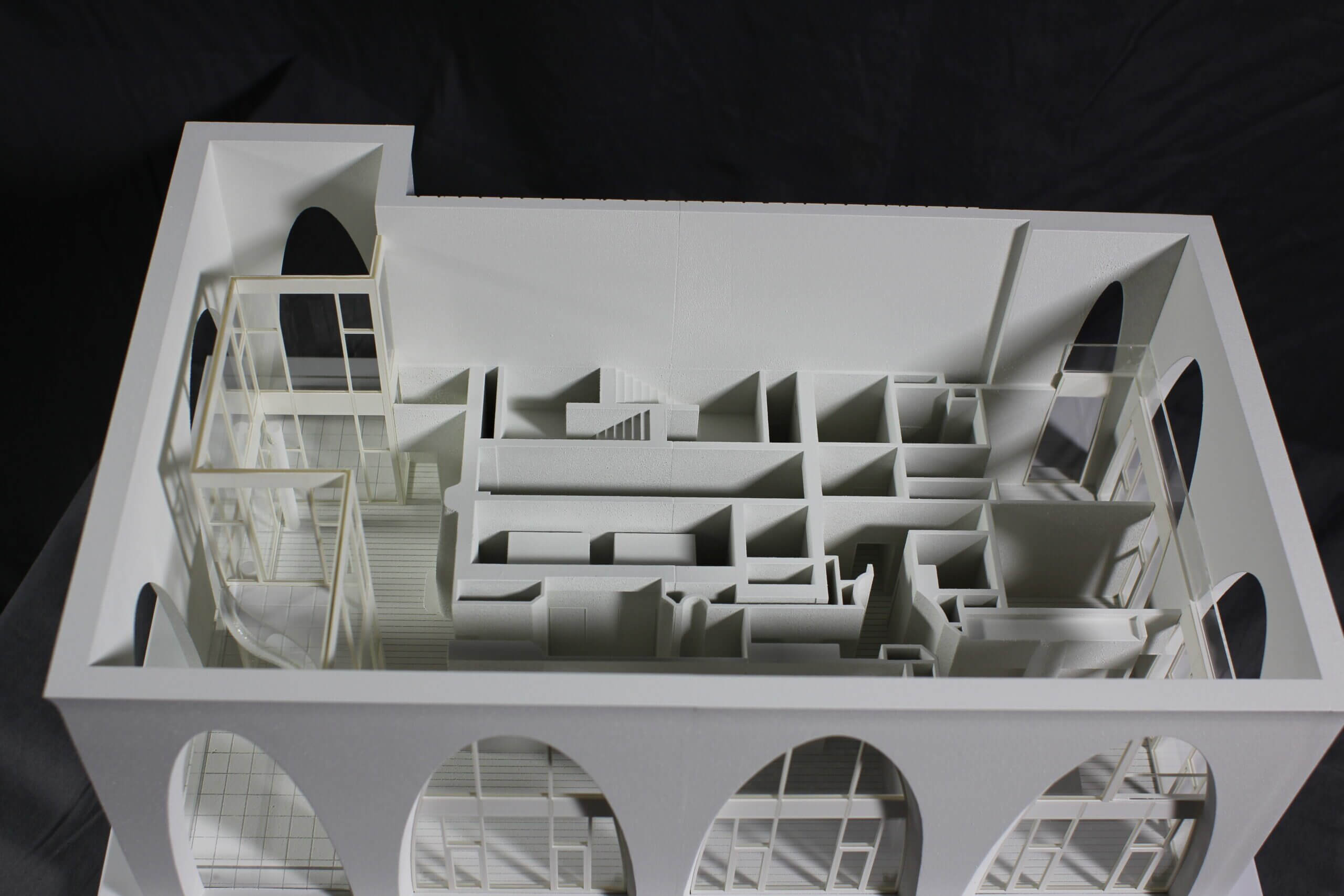 Interior layer models like this need to consider both user experience, as well as the architect’s design intent for the project. The final quarter scale representation offers insight into each floors interior layout without disrupting the crucial exterior aesthetic of the building. Clear windows were installed to emphasize the expansive light and shadow patterns through each layer.