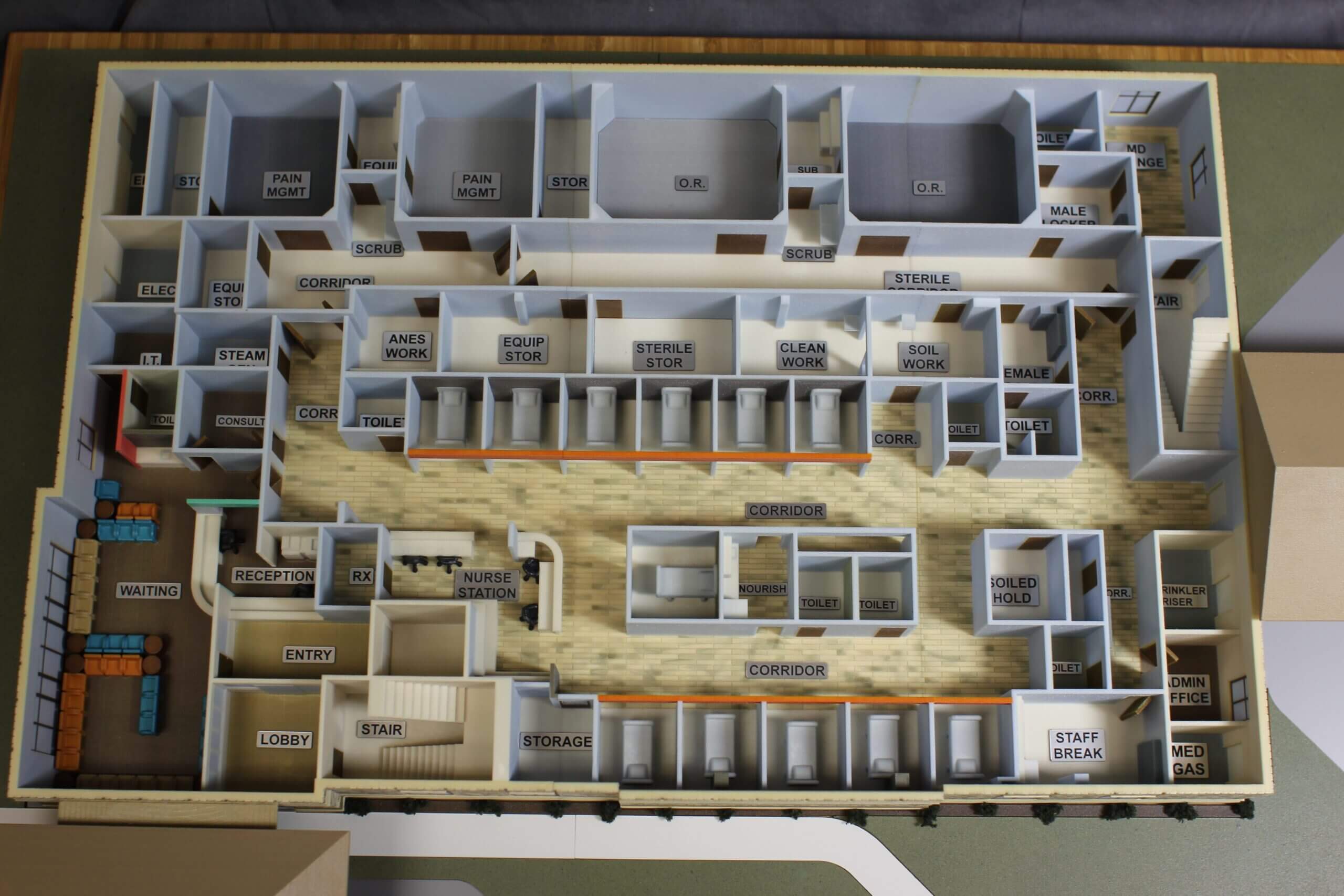 With an intricate color scheme and floor plan, LGM opted to fully color 3d print the building. The model separates by floor to display the interior program and facilities. The colors were matched to provided Sherwin Williams swatches and adhered to the designers finish schedule. A special “digital airbrushing” technique, along with surface texture application, added additional detail to the exterior brick and interior wood flooring to add interest.