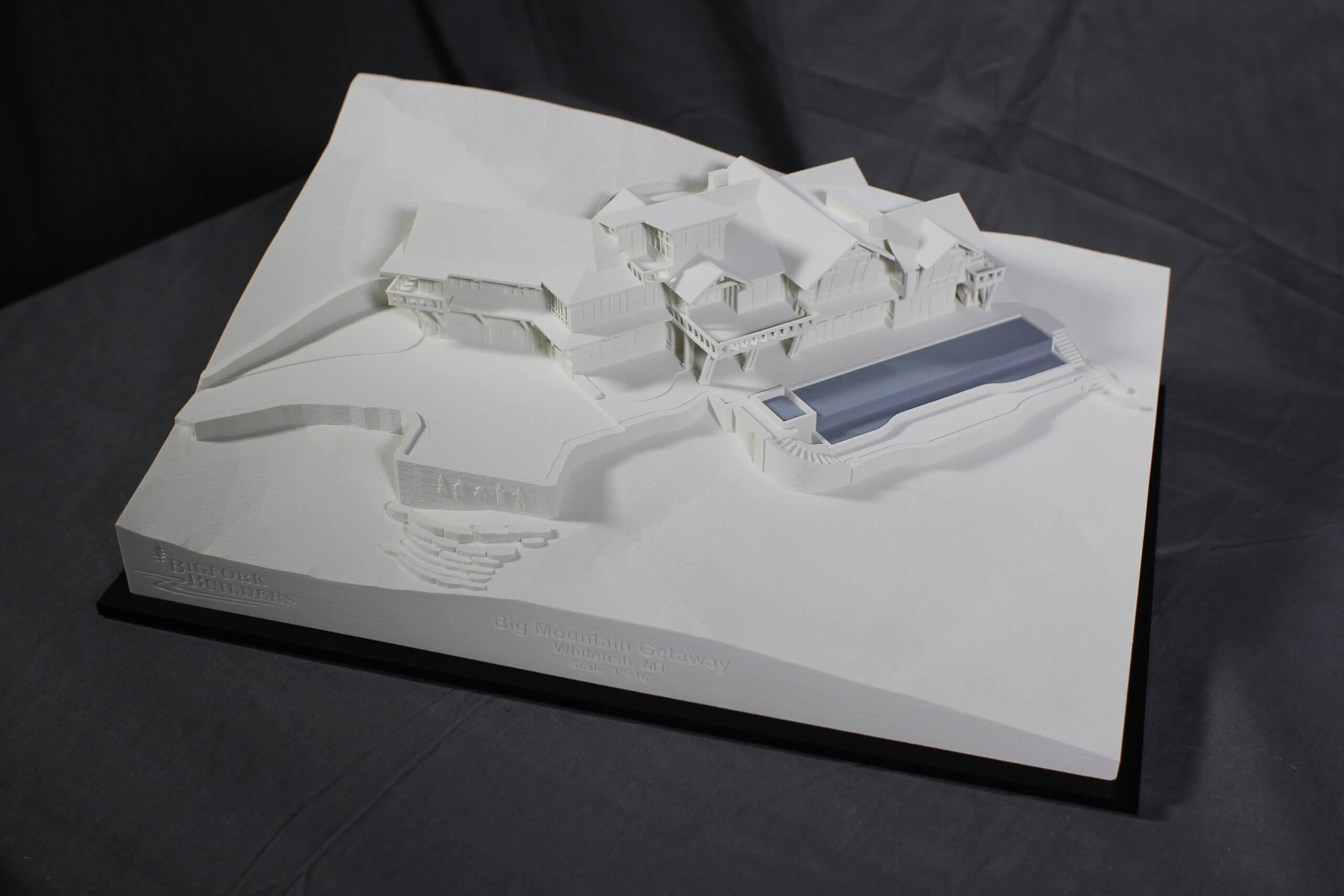 This residential home model provides a birds eye view of custom architecture, unique glazing details, and wood beam columns. For added interest, the water features were highlighted in a muted blue. As an added bonus, the model provides better perspective on the retaining wall and entry way experience surrounding the home.