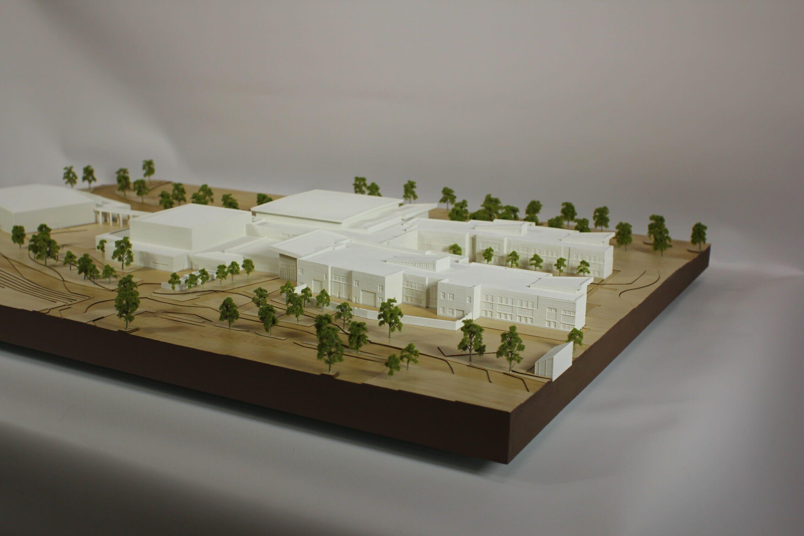 Treanor was looking for a unique display for their front foyer. Roosevelt High School is an incredibly important, award winning project to their firm, and it has taken several years to complete. By showcasing the model in a traditional architectural-style palette, both site and structure capture interest.